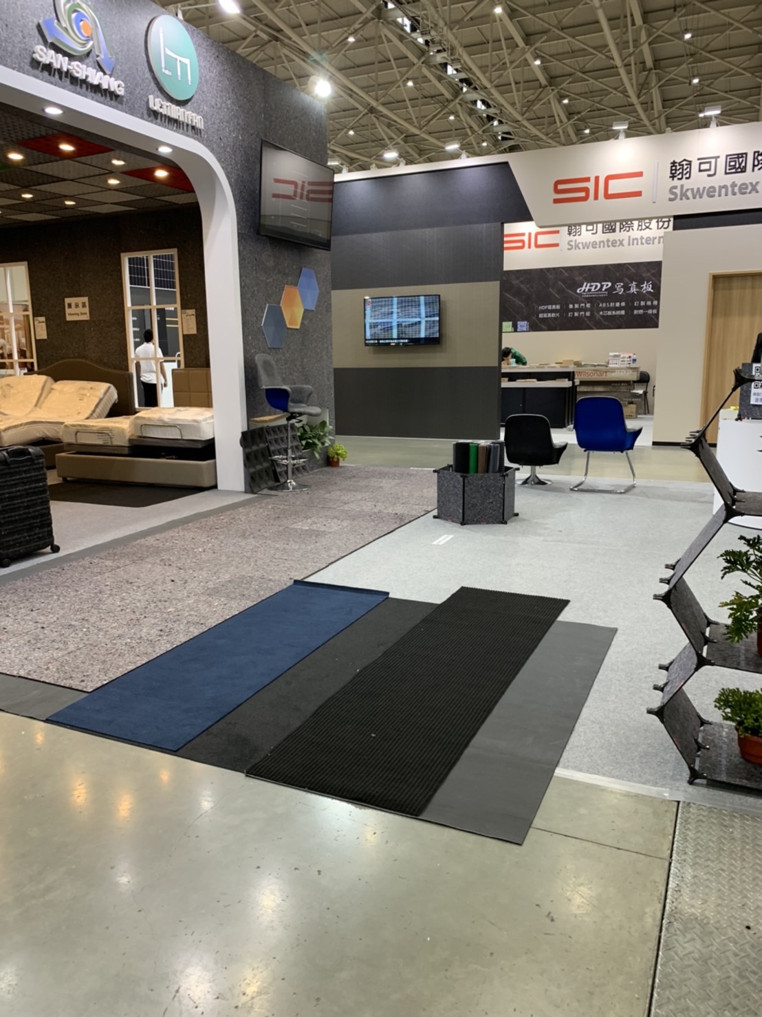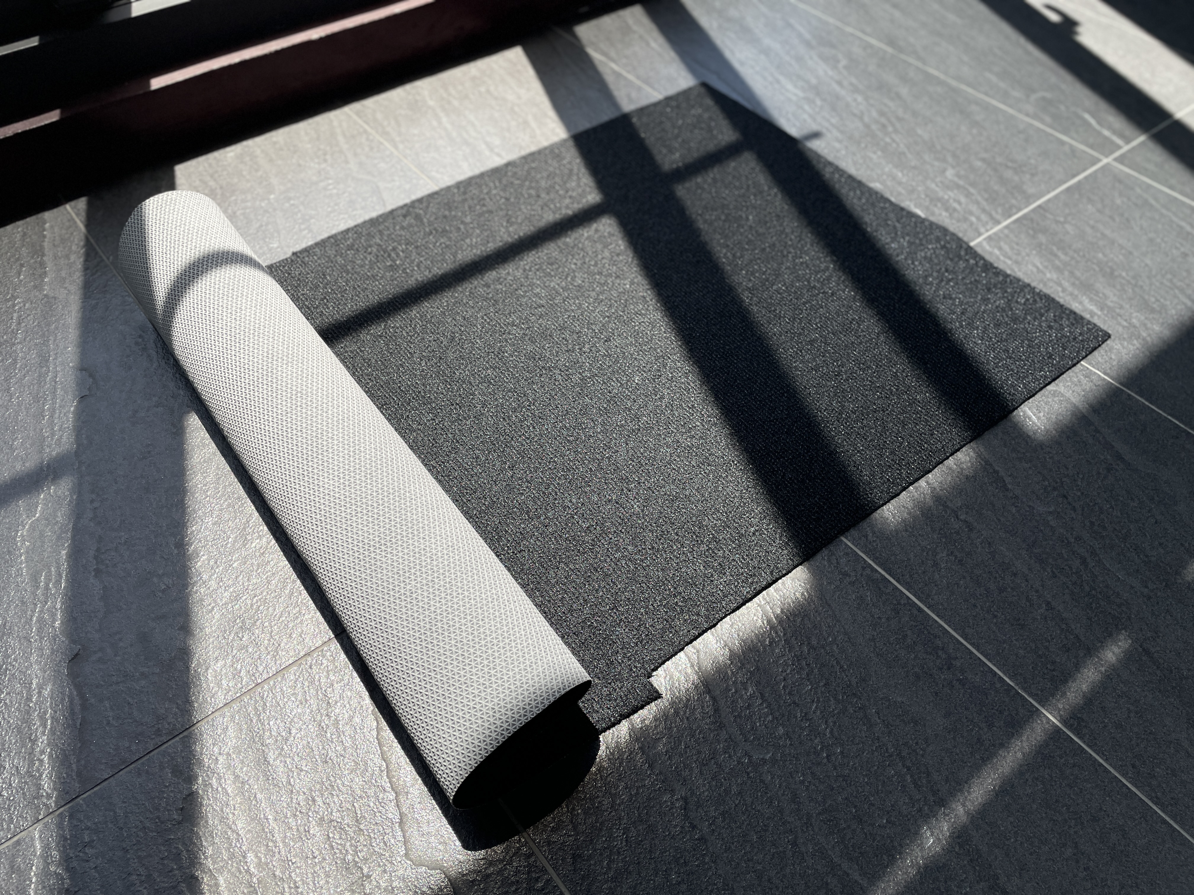 厚み: 3.8 mm ± 0.5 mm 上層: PETストライプ不織布(焼結処理) 下層: 熱溶融TPEコーティング 特長: 防滑・防水・遮音・耐圧耐摩耗